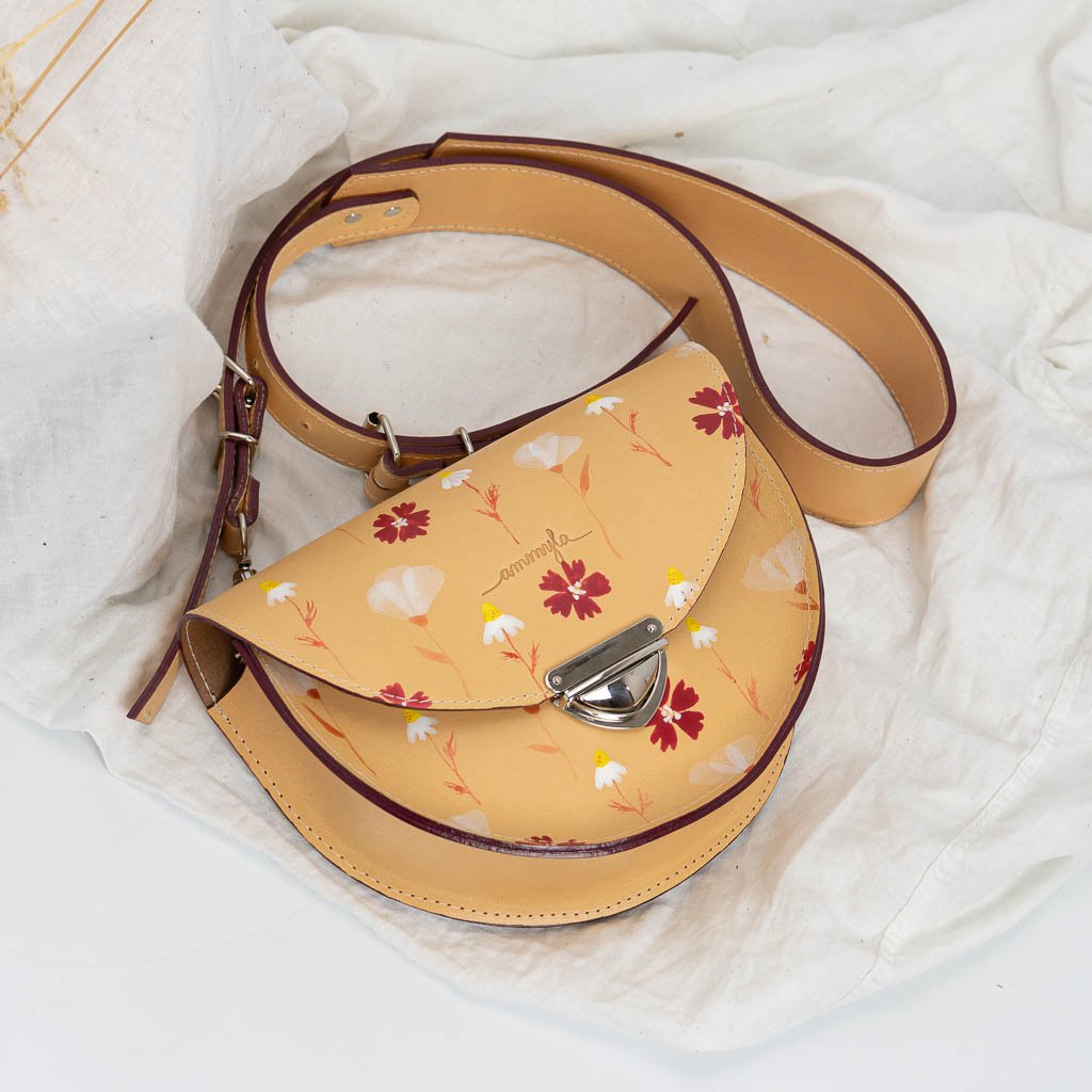 Táto kabelka je ideálna pre ženy, ktoré hľadajú kombináciu funkčnosti a jedinečného dizajnu. Ručne maľované nezábudky dodávajú kabelke romantický a jemný vzhľad, ktorý zaujme na prvý pohľad.