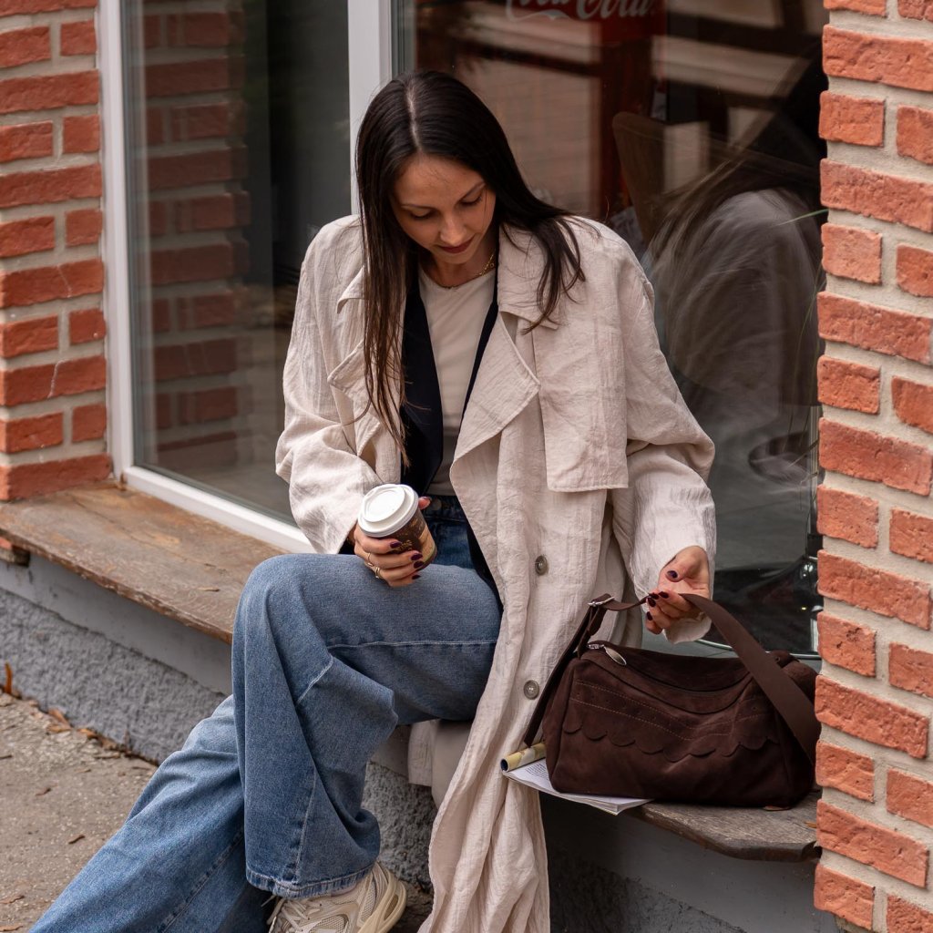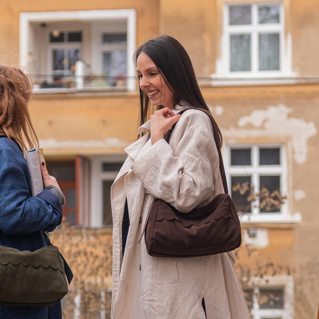 Nosí sa pohodlne na ramene pomocou širokého popruhu, ktorý je nastaviteľný. To znamená, že si ju môžeš prispôsobiť presne podľa seba – či už ju chceš mať ako klasickú ramennú kabelku, alebo ju prehodiť crossbody pre väčšie pohodlie a voľnosť pohybu. Popruh zároveň dopĺňa celkový naturálny charakter kabelky.