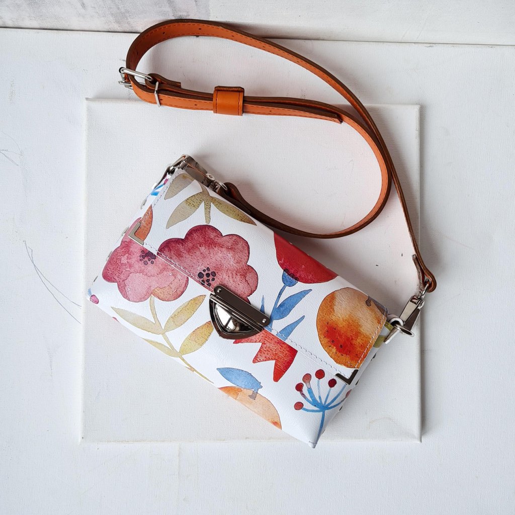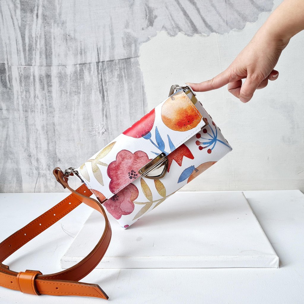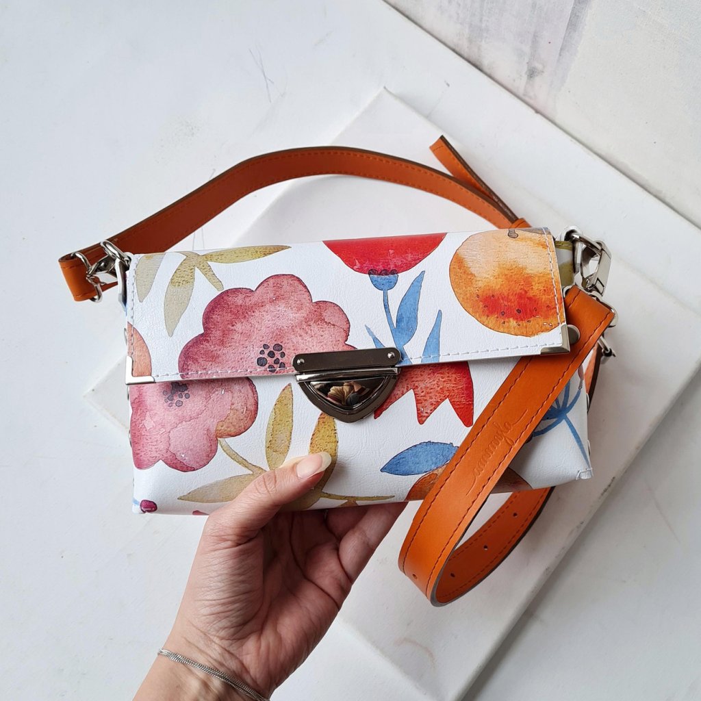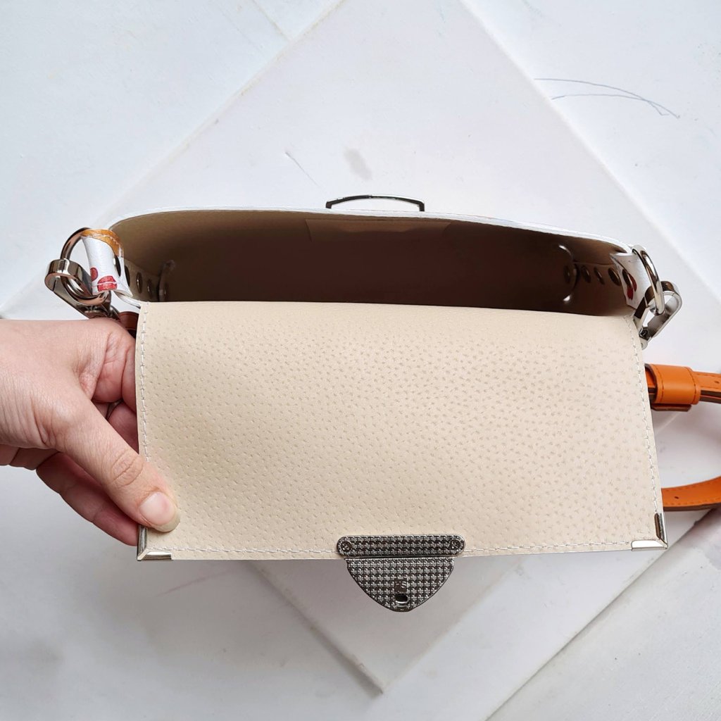 Na výrobu tejto kolekcie sme si zvolili kožu Bycast, ktorá má už sama o sebe povrchovú PU úpravu, pre vyššiu odolnosť a lesk. Vnútro sme podlepili tenkou jemnou kožou, ktorá dáva kabelkám pekný a pevný tvar a hrany sme ošetrili farbou a voskom. Farbu crossbody popruhu vám vieme upraviť, podľa vášho štýlu.