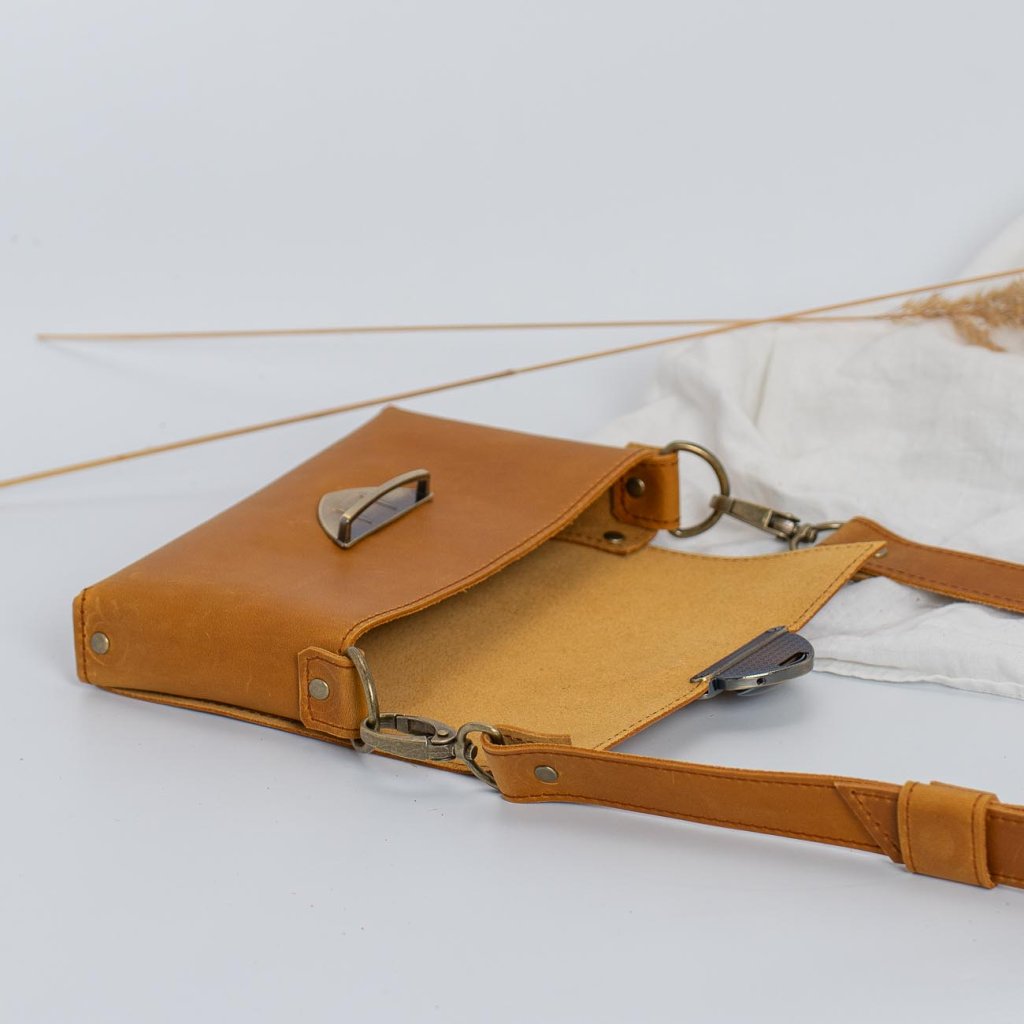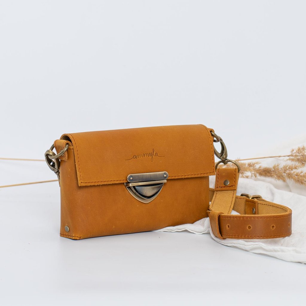 Dá sa nosiť ako ľadvinka, malá kabelka cez plece, alebo po odňatí popruhov slúži ako praktická peňaženka. Ideálna pre tých, ktorí milujú minimalistický dizajn a viacúčelové doplnky. Je ušitá z kvalitnej hovädzej kože a zatvára sa na kovové zapínanie na príklopke. Kabelka je spájaná výlučne nitmi, čím získava výnimočne čistý vzhľad bez zbytočných švov. Obvod kabelky je prešitý pevnou niťou, čo zabezpečuje jej tvarovú stálosť a odolnosť. Popruh je vyrobený z dvoch vrstiev kože, zošitý pre väčšiu pevnosť. Hrany kabelky aj popruhu sú ručne ošetrené farbou na kožu a voskom. Popruh je kratší, ideálny na nosenie cez plece alebo ako ľadvinka – jednoducho si ho prispôsobíte.