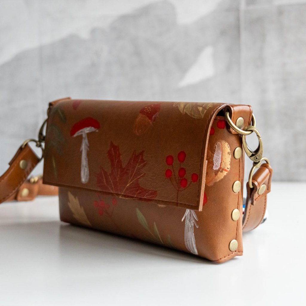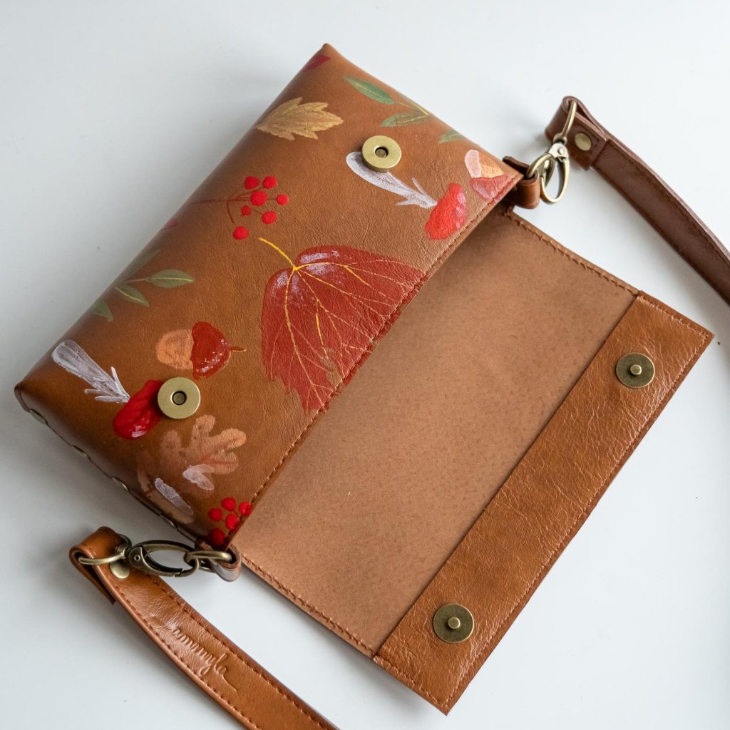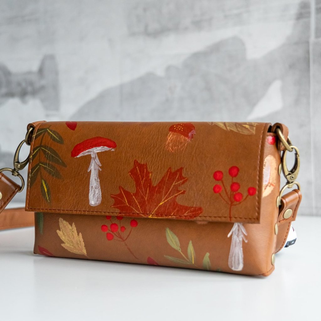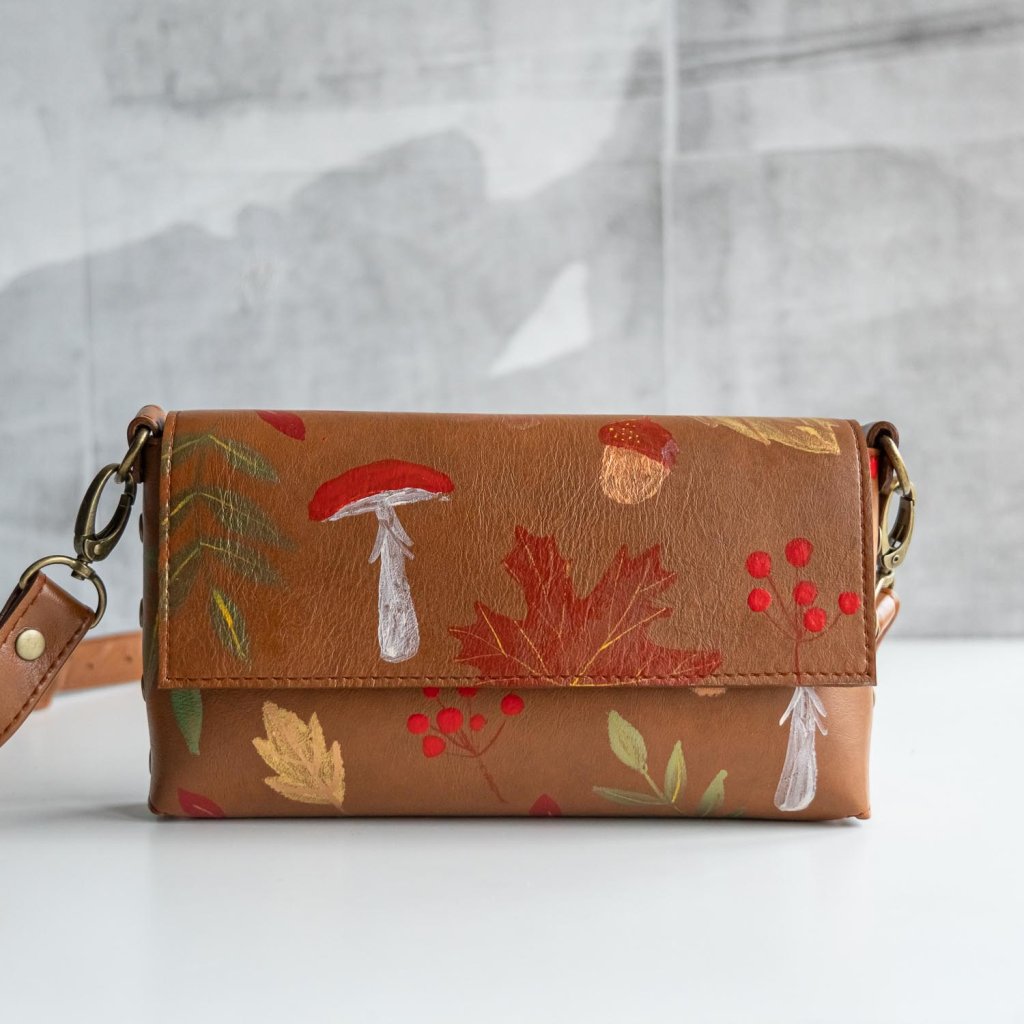 Ručne maľovaná kožená kabelka MidiMe (jesenný les I.) Skladom